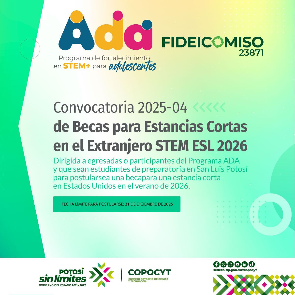 El Consejo Potosino de Ciencia y Tecnología (Copocyt) lanzó la Convocatoria 2025-04 de Becas para estancias cortas en el extranjero “STEM ESL Program for High School Students 2026”, dirigida a estudiantes mujeres de preparatoria participantes o egresadas de ADA, Programa de fortalecimiento en STEM+. Esta iniciativa busca ofrecer experiencias de aprendizaje internacional que amplíen las capacidades académicas y personales de las jóvenes, reflejando la visión del Gobernador Ricardo Gallardo Cardona de impulsar oportunidades educativas sin límites.