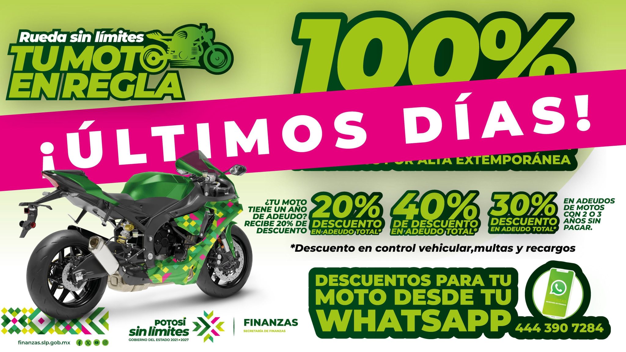 Como parte de las políticas de apoyo del Gobernador Ricardo Gallardo Cardona, la Secretaría de Finanzas (Sefin) mantiene vigente hasta el 10 de diciembre el programa “Tu moto en regla, rueda sin límites”, una estrategia que facilita la regularización de motocicletas con beneficios directos para las y los propietarios, accediendo a descuentos del 40, 30 y 20 por ciento en adeudos totales, dependiendo del rezago, además de un apoyo del 100 por ciento en multas, recargos y actualizaciones para unidades nuevas que aún no cuentan con registro.